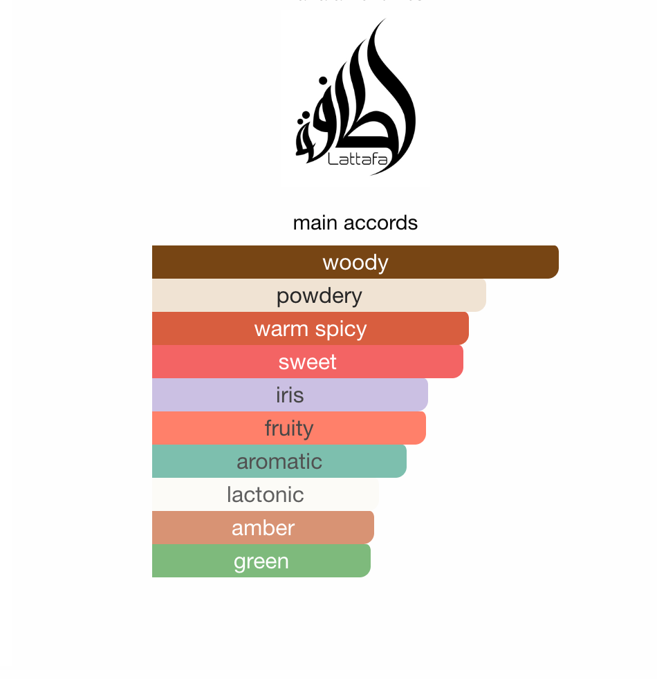 Duften åpner med kardemomme, fiken, kokos, melk og sort te som gir en myk, krydret og lett gourmand start. I hjertet tilfører iris, vetiver og jasmin en pudret, grønn og floral eleganse. Basen avrundes med amber, sandeltre, tonkabønne, karamell og musk for en varm, sensuell og langvarig avslutning.
