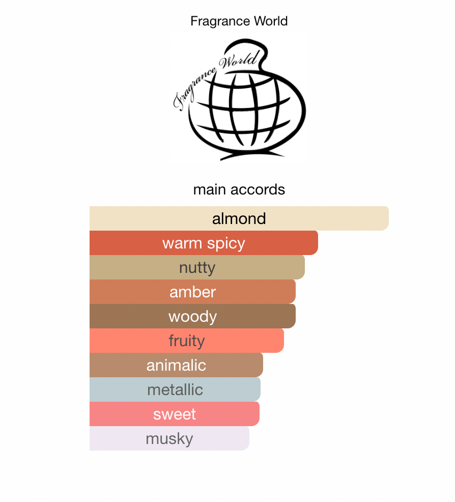 Duften åpner med en dristig og bitter tone fra brente mandler, mykt pakket inn i gyllen safran. I hjertet finner vi ren, egyptisk sjasmin kombinert med varme toner av edelt sedertre, en duftkjerne som utstråler styrke og eleganse. Basen avrundes med sensuell musk, dyp rav og treaktige noter som gir duften langvarig dybde og gjenkjennelig karakter.