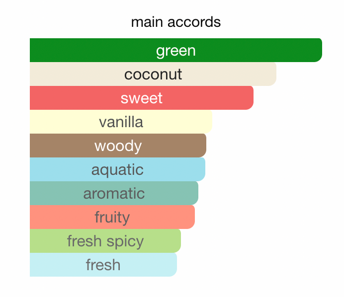 Duften åpner friskt med akvatiske noter, grønne blader, mynte og ingefær som gir energi og vitalitet. I hjertet finner du kokos, kremet fiken og salte noter som minner om havbris og tropiske netter. Basen avrundes med myk sandeltre, tonkabønne og et hint av vanilje for en varm og varig avslutning.