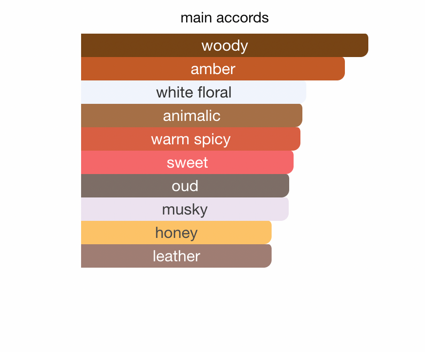 Duften åpner med en kraftfull blanding av orientalske krydder som gir en varm og eksotisk start. I hjertet finner du en elegant kombinasjon av rose og musk, som tilfører dybde og sensualitet uten å miste den maskuline styrken. Basen består av mørk oud, lær og amber som gir et rikt og langvarig avslutning.
