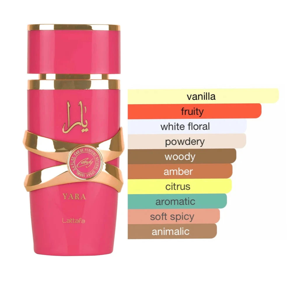 Oppdag Yara Candy fra Lattafa, en søt og uimotståelig nyhet i Yara-familien. Laget med nøye utvalgte ingredienser fra hjertet av Midtøsten, byr Yara Candy på en harmonisk blanding av søte kandiserte frukter og deilig vaniljesirup. Denne delikate duften er perfekt for de som setter pris på balansen mellom sødme og eleganse. Gjør Yara Candy til din nye signaturduft!