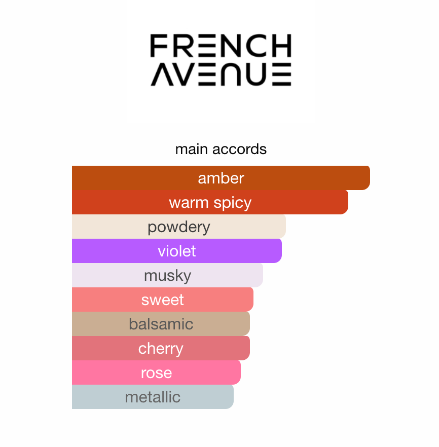 Duften åpner friskt og krydret med rosa pepper, kirsebær og safran. I hjertet finner du florale noter av rose og fiol som tilfører mykhet og eleganse. Basen avrundes med varm musk, myrra, ambergris og røkelse som gir dybde, karakter og en subtil røykaktig varme.