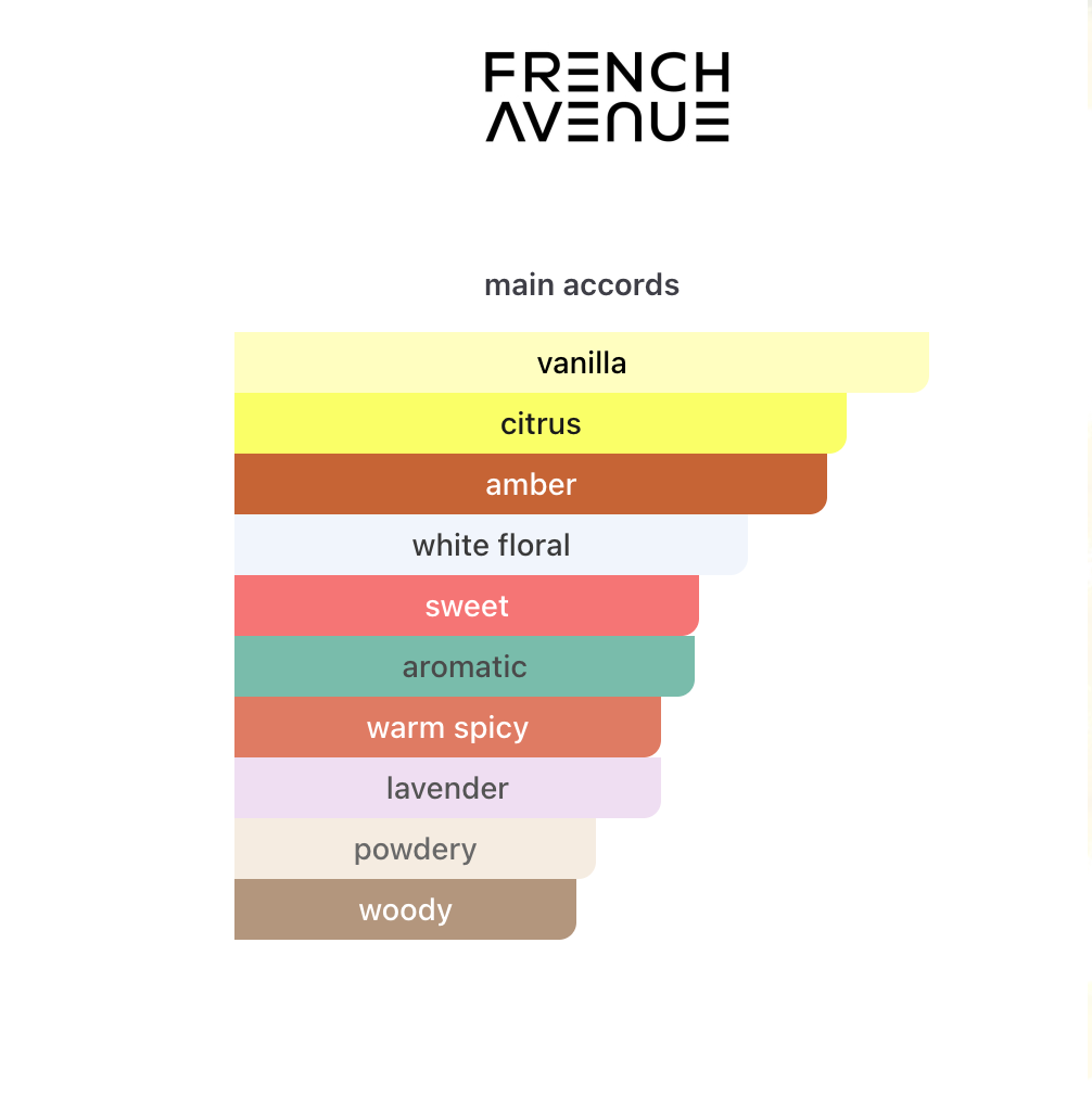 Duften åpner friskt og aromatisk med sitrusnoter, lavendel og kardemomme. I hjertet møter appelsinblomst og rose det røffe preget av guaiacwood, før basen legger seg tung og sensuell med tørr amber, vanilje, tonkabønne og eikemose.