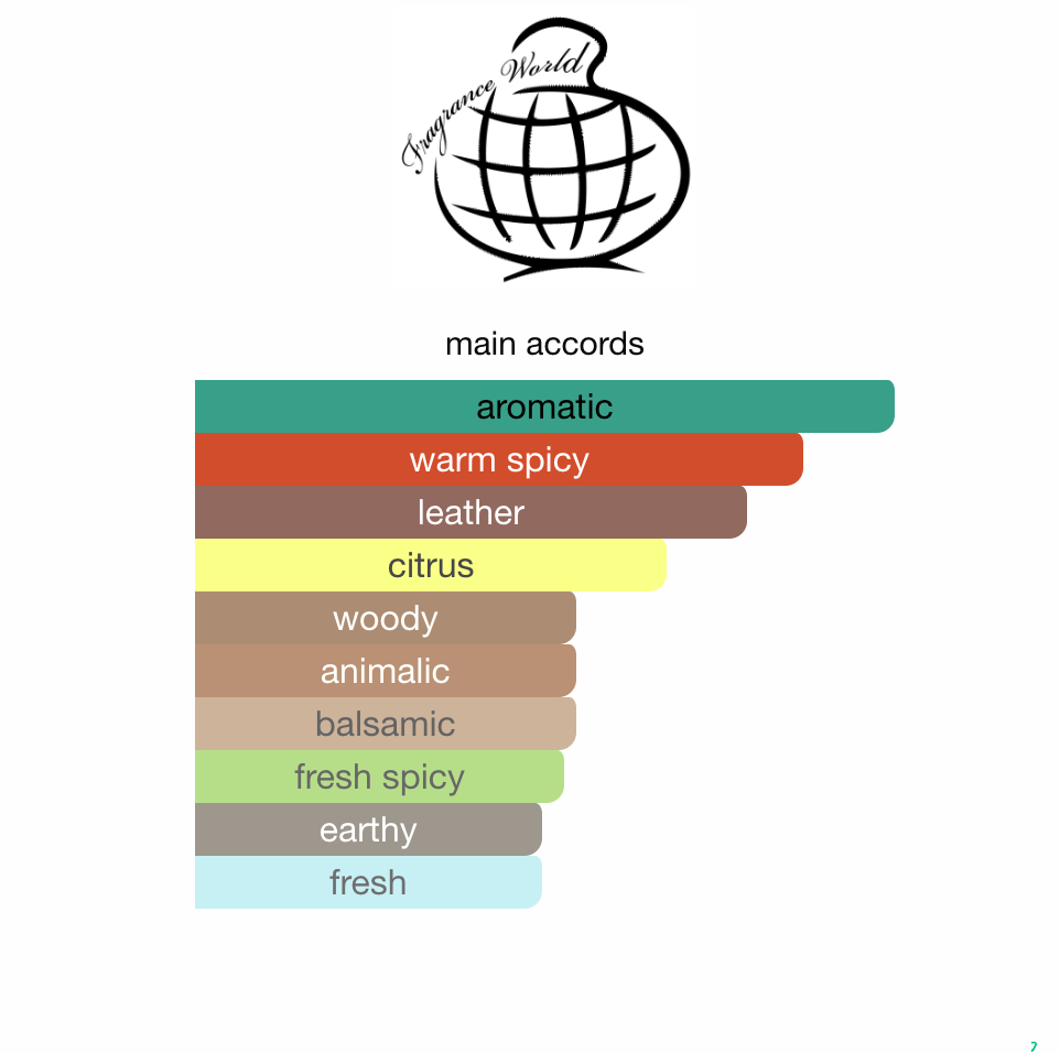Den åpner med en energisk eksplosjon av rosa pepper, elemi, bergamott og grapefrukt, som gir en frisk og aromatisk start. I hjertet finner du krydrede toner av safran, paprika og kanel, som tilfører varme og dybde. Basen avslutter duften med en kraftfull blanding av tobakk, skinn og vetiver, en sammensetning som utstråler ren maskulinitet.