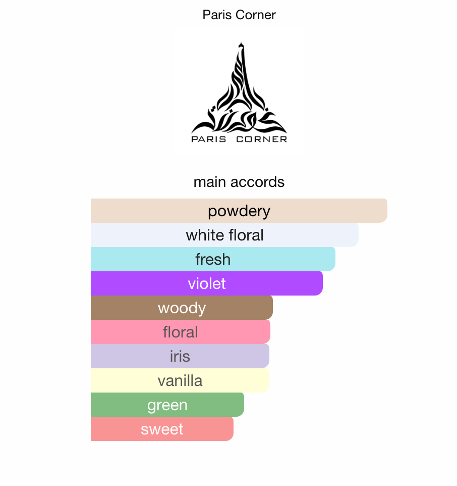 En drømmende og elegant duft med en frisk åpning av pasjonsfrukt og rose. I hjertet finner du myke blomster som sjasmin, fiol, liljekonvall og orris, som gir parfymen en pudret og romantisk karakter. Basen avslutter med varme toner av sandeltre, sedertre, vanilje og musk som gir et mykt og sofistikert preg.