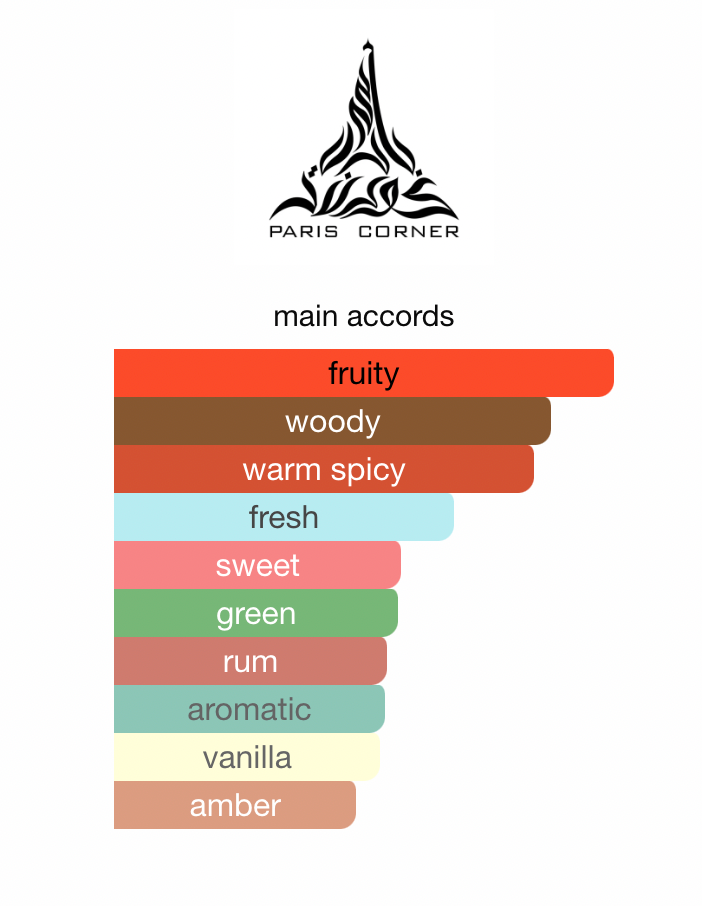 I hjertet smelter saftige epler, ananas og hint av rom og brandy sammen med vanilje og mose, og skaper en luksuriøs og fristende duftopplevelse. Basen avrundes med ambroxan og sedertre, som gir varme og dybde til helheten.