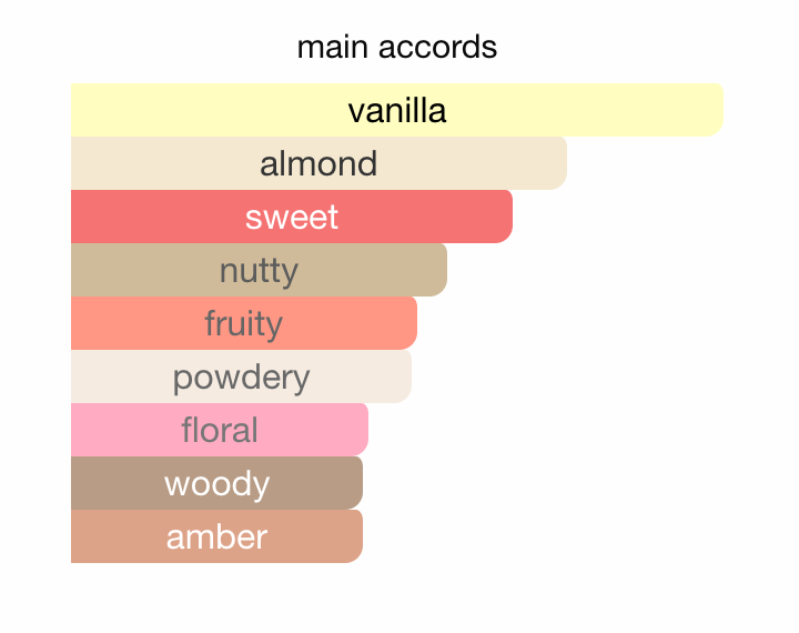 Duften åpner med en lett bitter tone av mandel, før den glir over i et mykt og forførende hjerte av vanilje og florale noter. Basen avslutter med en fyldig blanding av vanilje absolute, ultravanil, tonkabønne og sandeltre som gir parfymen varme og langvarig dybde.