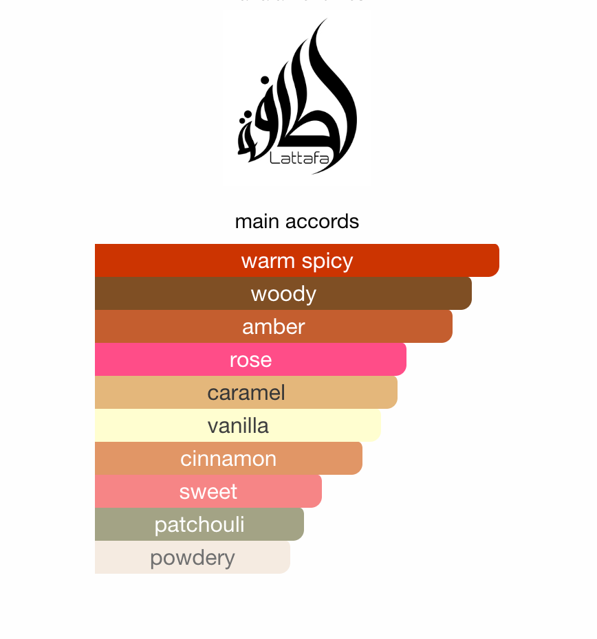Lattafa Sheikh Al Shuyukh Luxe Edition kombinerer edle krydder med varme, treaktige noter og en myk touch av vanilje. Duften åpner med rike aromaer av kanelbark, forførende roseblader og krydret safran. Hjertenotene avslører en uimotståelig blanding av karamell og patchouli, mens basen tilfører en sensuell mykhet med vanilje, edle treakkorder, amber og ambroxan. Denne harmonien sikrer både varighet og varme i duften, noe som gjør den perfekt for enhver anledning.