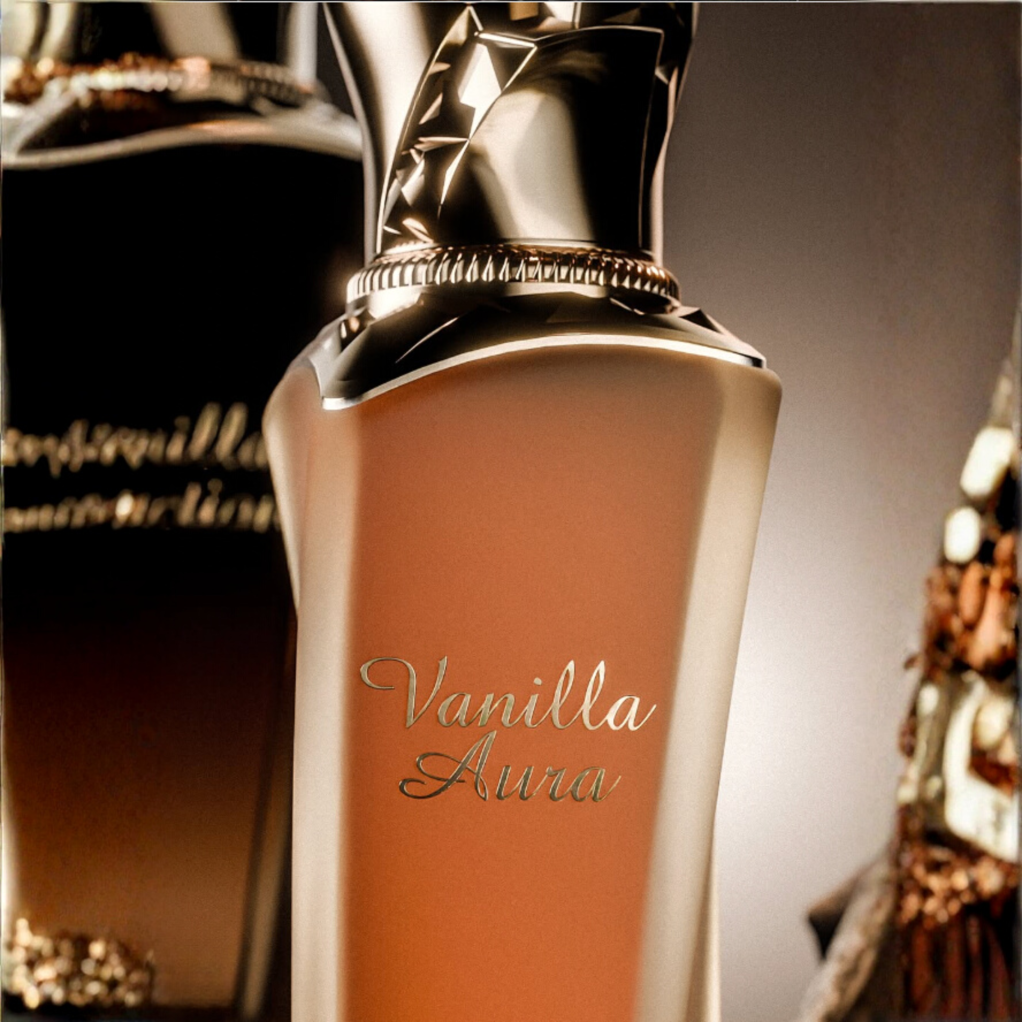Der varme møter lys. Vanilla Aura åpner med en strålende friskhet av bergamott, sitron og liljekonvall, før den smelter inn i et mykt hjerte av karamell, vanilje og sjokolade.
