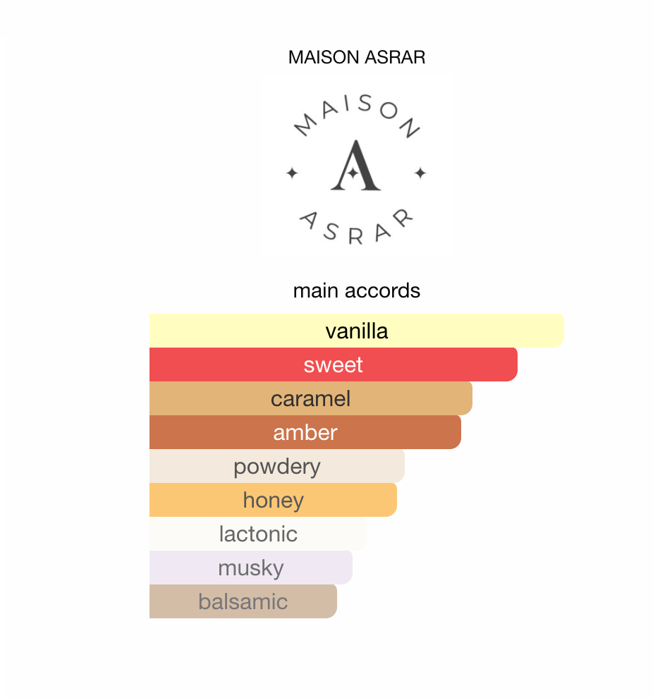 Duften åpner med rike noter av karamell og smør som gir en myk og deilig start. I hjertet finner du jasmin, tonkabønne og honning som tilfører varme og dybde. Basen avrundes med kremet vanilje, myk musk og amber som gir en behagelig og langvarig avslutning.